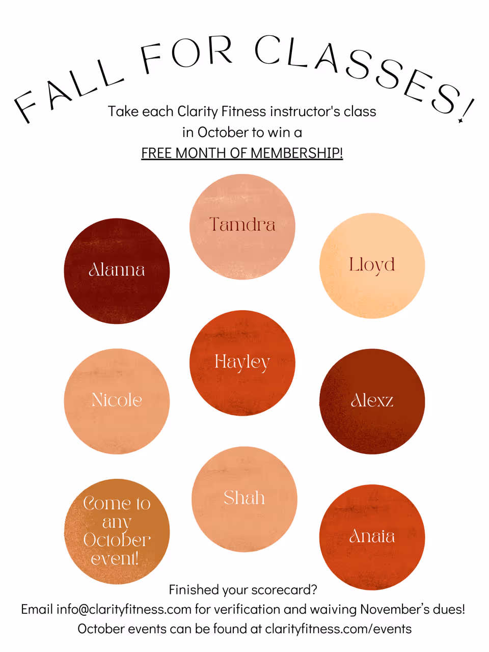 Every Clarity member who comes to every instructor’s class in October gets November dues FREE!